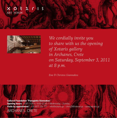 We cordially invite you to share with us the opening of Xotaris gallery in Archanes, Crete on Saturday, September 3, 2011 at 8 p.m.